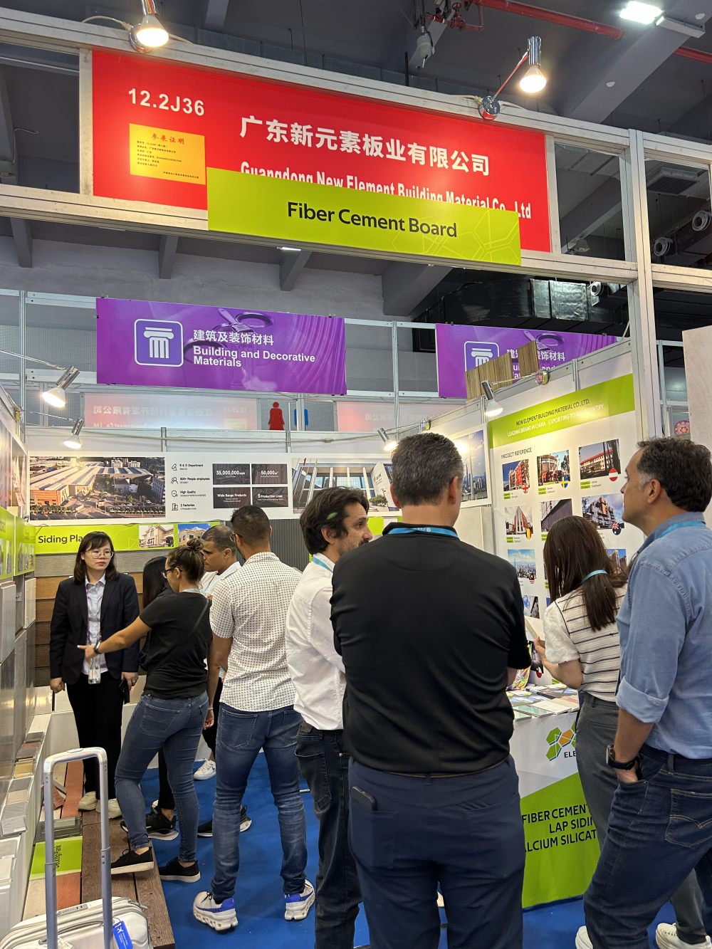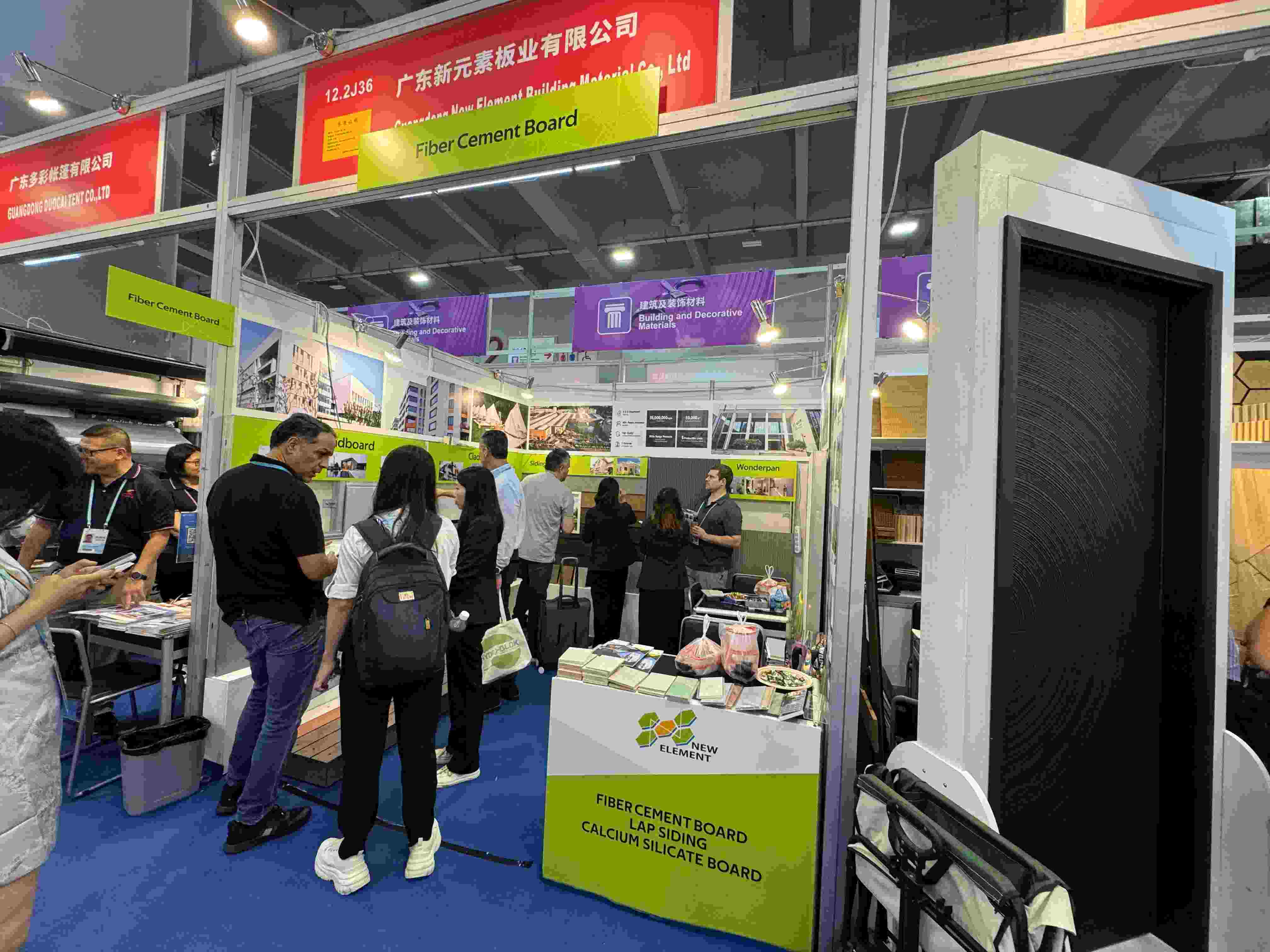 Guangdong New Element Building Material Co., Ltd. is a company with 21 years of experience, specializing in the production of fiber cement boards and calcium silicate boards. As an exhibitor with extensive experience, our booth attracted customers from around the world.